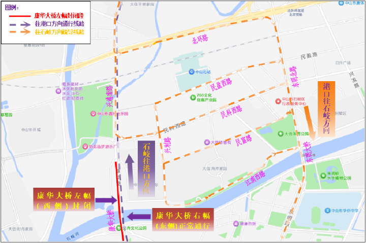 封闭期间,右幅(东侧)石岐往港口方向经康华大桥的车辆正常行驶,原港口往石岐方向经康华大桥的车辆需通过东明大桥及其它周边道路绕行。由此带来的交通不便,敬请谅解。