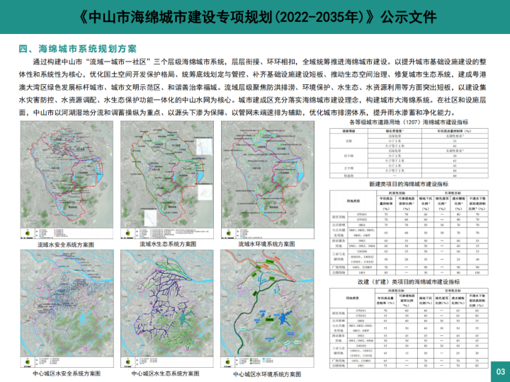 在流域层面,重点补齐防洪排涝、水生态修复和水资源利用等短板,通过打造集水灾害防控、水资源调配和生态保护功能于一体的中山水网体系,全面提升城市水安全韧性。在城市层面,系统推进建成区海绵化改造,统筹排水防涝设施建设、水环境污染治理、生态廊道构建和保护。在社区和设施层面,重点实施海绵设施建设和排水管网优化等工程,全面提升城市雨洪管理和水环境净化能力。