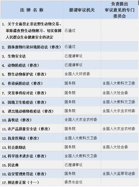 健全国家公共卫生应急管理体系,涉及公共卫生相关的法律,还有基本医疗卫生与健康促进法、中医药法、药品管理法、疫苗管理法、献血法、职业病防治法、精神卫生法、母婴保健法等;涉及动植物和动物源性食品安全有关的法律,还有渔业法、食品安全法等;涉及疫情防控有关问题的法律,还有红十字会法、慈善法、公益事业捐赠法等。对上述立法项目,结合疫情防控和健全公共卫生应急管理体系,开展深入评估,经研究论证,有必要又可行的,采取多种形式,有针对性进行修改,适时安排审议。