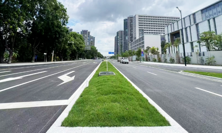 上述项目通车不仅有效缓解了学校师生及周边居民的“出行难”问题,更被列为中山市海绵城市示范路段。据工口漫画 项目负责人介绍,沙湾路(濠江西路北侧段)人行道采用30×60cm尺寸的花岗岩材质,提升了人行道的耐久性、平整度、美观性,结合下沉式绿化带,能够调蓄和净化径流雨水,缓解城市排水系统压力,降低道路内涝风险,并提升城市景观品质。国际学校北侧路人行道采用仿花岗岩色调的透水环保砖,不仅能有效解决传统硬化路面的积水问题,其粗糙纹理设计还能提升道路的防滑性能,为市民出行提供安全保障。