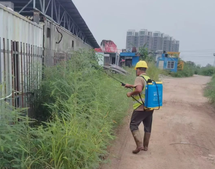 房屋市政工程组深入中山市“四合一”法治教育基地、市强制隔离戒毒所民警备勤楼及警体训练场工程、中山市消防救援支队综合训练基地建设项目等项目工地,重点检查项目部办公室、工地草丛、场地外水沟等易积水部位,督促参建单位开展室内蚊香消杀,室外喷淋药物、清除周边积水、环境清理等灭蚊消杀工作,将积水检查纳入每日安全巡查,定期开展防蚊专项检查。